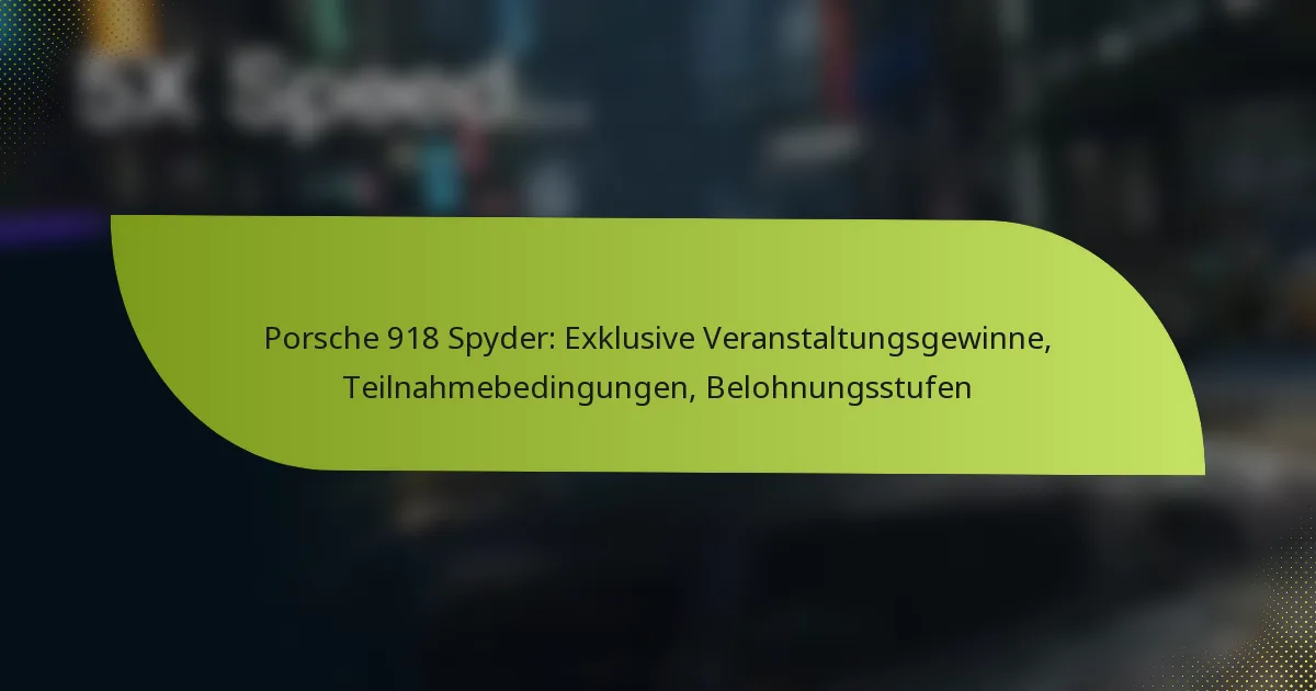 Das Porsche 918 Spyder-Event bietet eine spannende Gelegenheit, exklusive Preise zu gewinnen, die das Luxusautomobile Erlebnis aufwerten. Um teilzunehmen, müssen die Teilnehmer bestimmte Teilnahmebedingungen erfüllen und den Registrierungsprozess abschließen, der Altersbeschränkungen und mögliche Gebühren umfasst. Mit mehreren verfügbaren Belohnungsstufen können die Teilnehmer eine Vielzahl von einzigartigen Erlebnissen und Vorteilen genießen, die auf ihrem Teilnahmegrad basieren.